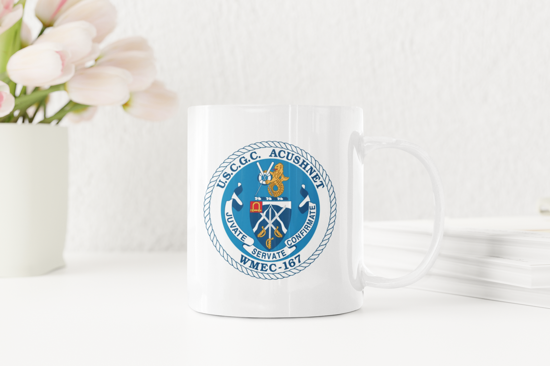 Choose this clean design with the USCGC Acushnet WMEC-167 emblem. Available in 11-oz or 15 oz ceramic mug.